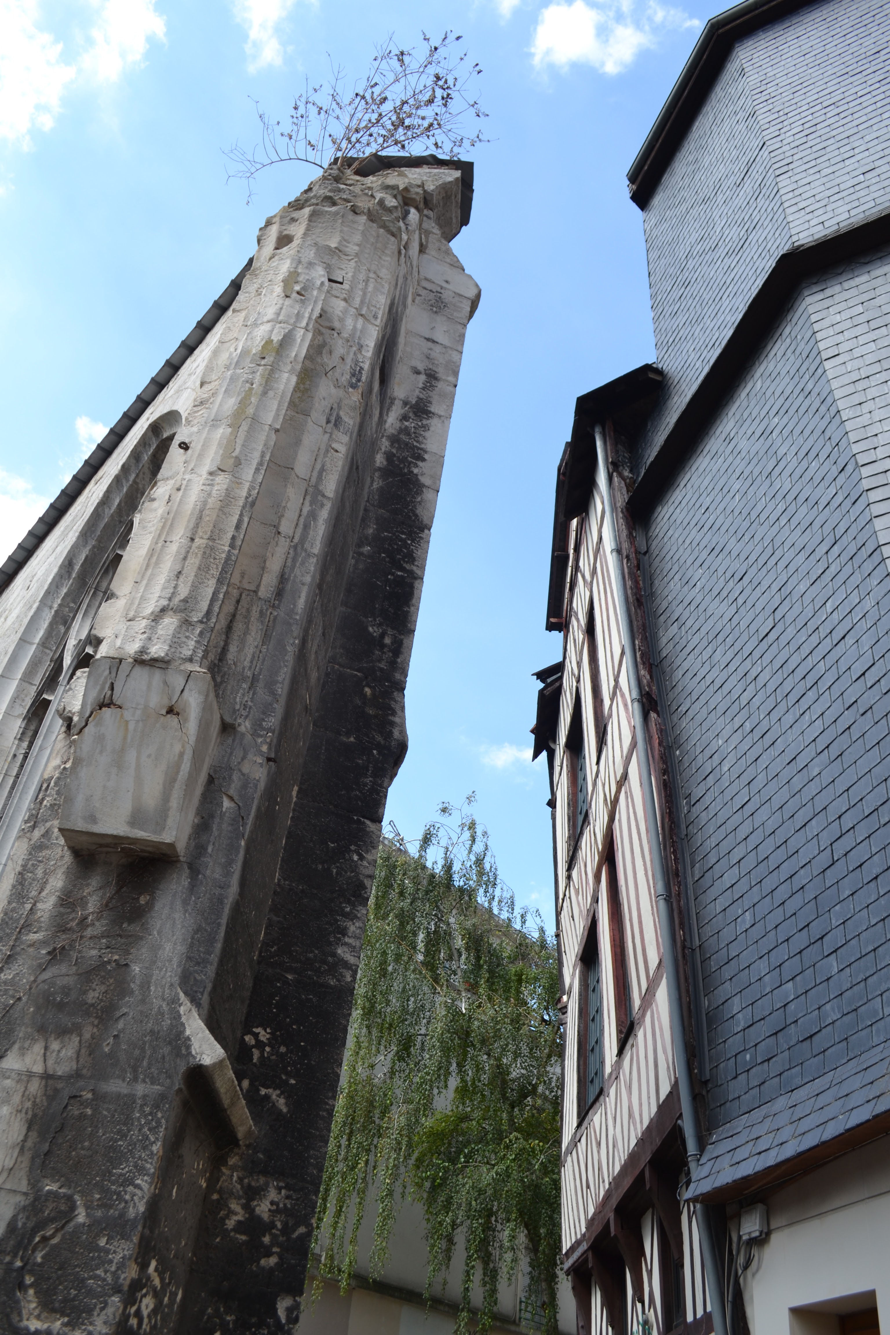 Ce qui est admirable à Rouen, c'est que les murs de toutes les maisons sont formés de grands morceaux de bois placés verticalement à un pied les un des autres: l'intervalle est rempli par de la maçonnerie. Mais les morceaux de bois ne sont point recouverts par le crépi; de façon que, de tous les côtés l'oeil aperçoit des angles aigus et des lignes verticales."